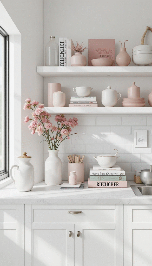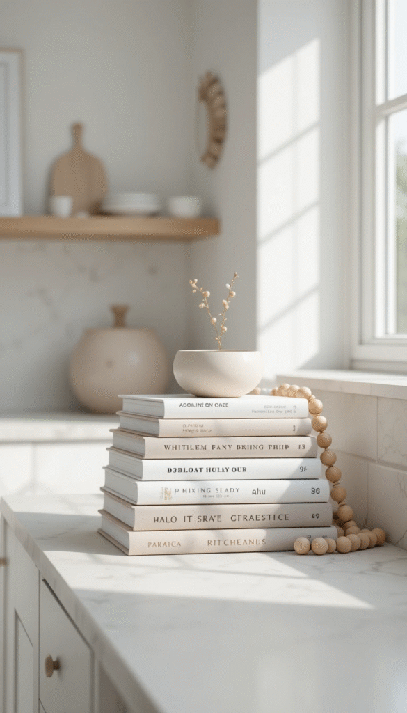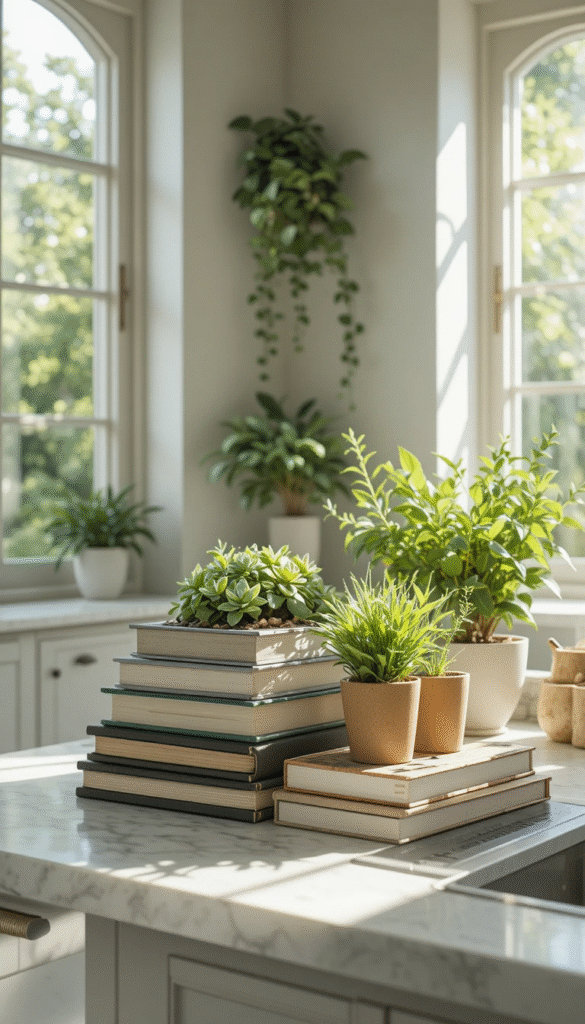 Combine a stack of cookbooks with fresh herbs in small pots. This pairing feels fresh and practical while adding color to your kitchen.