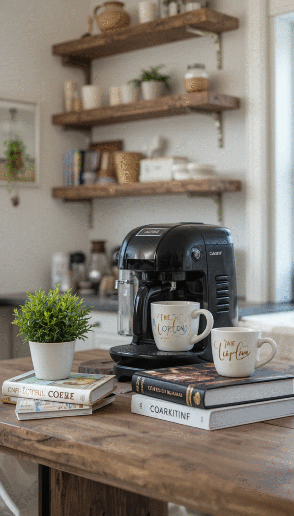 Turn your coffee station into a styled masterpiece by placing 2–3 coffee-themed books beside your espresso machine. Add a small plant and a decorative mug to complete the look. This idea creates a cozy café vibe at home while keeping the counter visually organized and inviting.