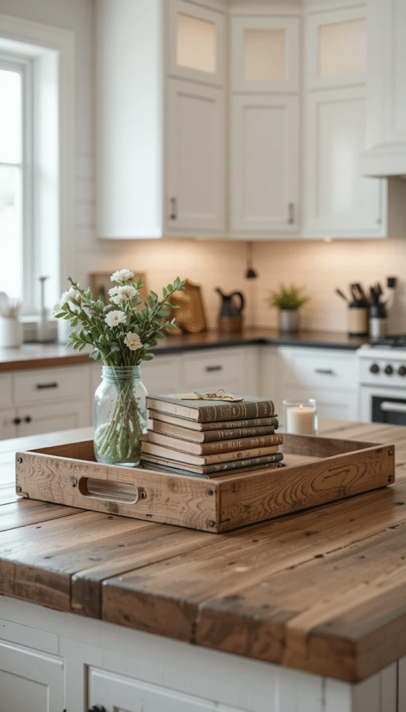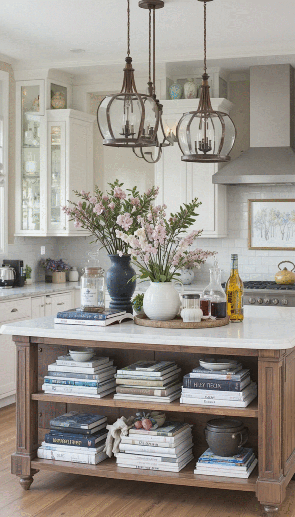 Place a few stacked books inside a rustic wooden tray on your kitchen island. Top the stack with a small candle or mason jar filled with greenery. This farmhouse-inspired book counterpiece adds warmth and charm, making it ideal for traditional and country-style kitchens.