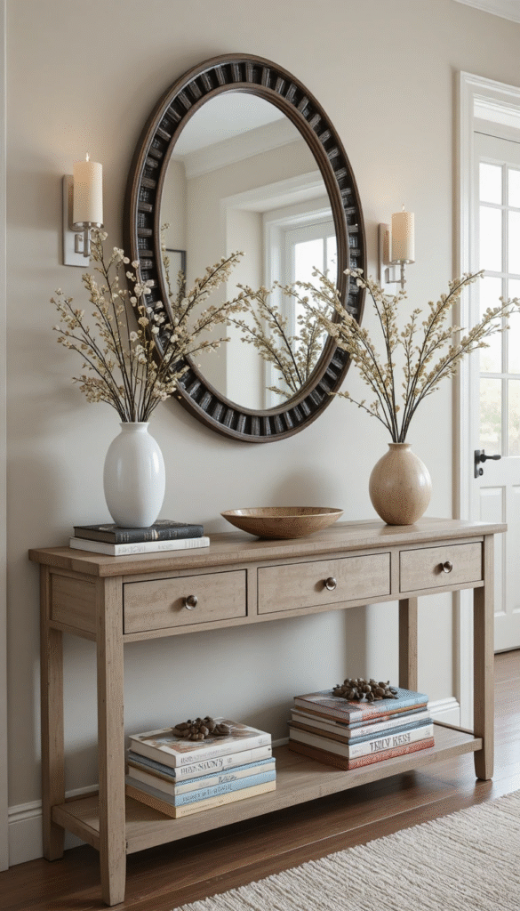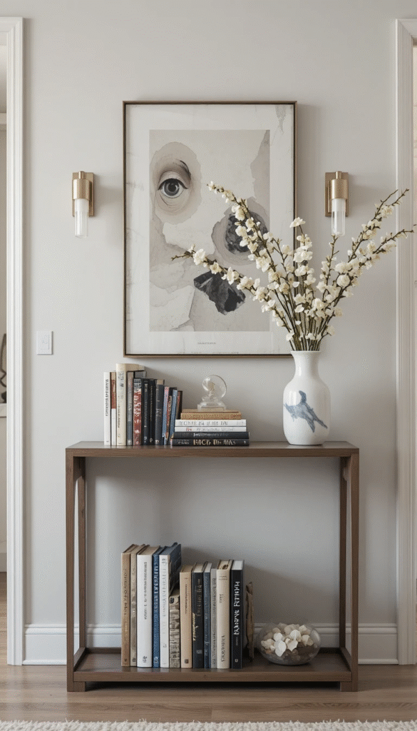 Place a welcoming-themed book stack on your entryway console. Add a small sign or decorative bowl for keys. This creates a warm first impression for guests.