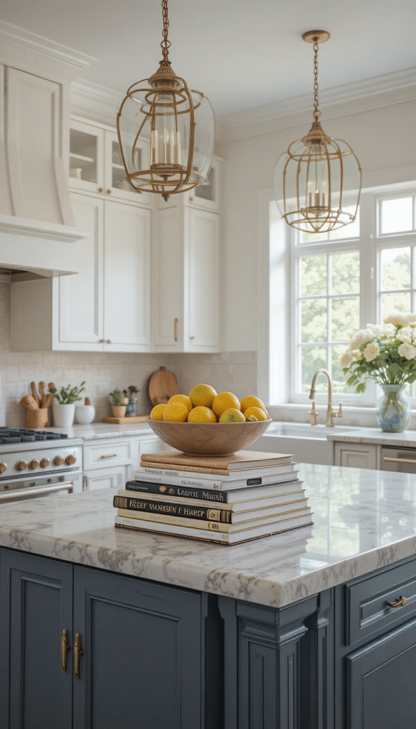 Use large hardcover cookbooks as a centerpiece on your kitchen island. Stack them neatly and top with a decorative bowl filled with lemons or green apples. This adds color and makes your island look professionally styled while keeping useful books accessible.