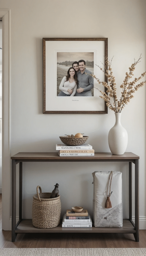 Place framed family photos on top of a stacked book counterpiece. This adds emotional warmth and makes your décor more meaningful. Use neutral frames to keep the look cohesive and elegant.