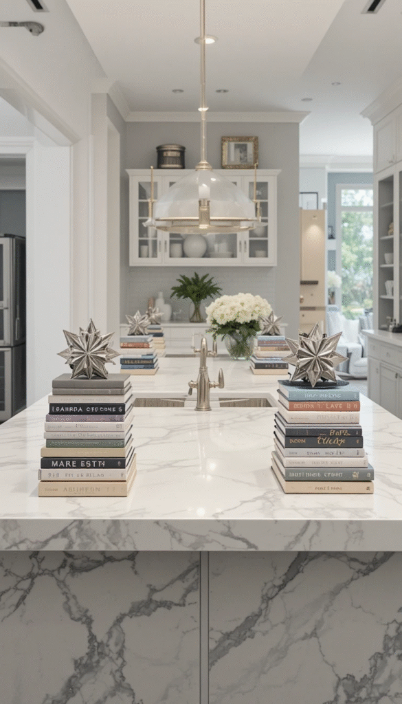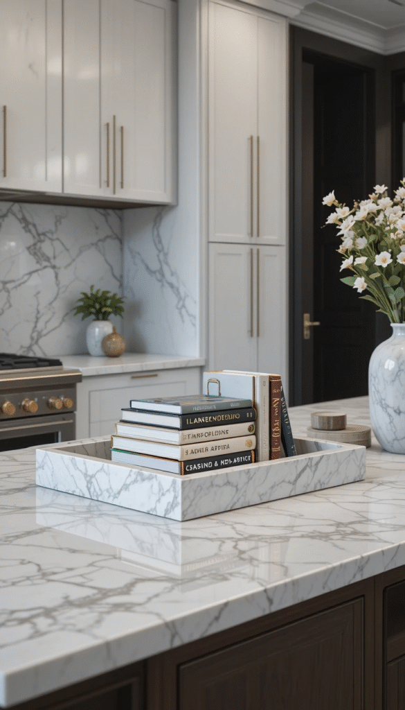 Combine stacked books with marble trays or stone coasters. The natural texture contrasts beautifully with paper covers, creating a modern organic aesthetic. This idea works well in luxury kitchens and bathrooms.