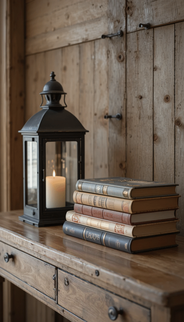 Place a rustic lantern beside a small book stack on your console or side counter. The combination of metal and paper creates depth and visual interest, especially in farmhouse and industrial homes.
