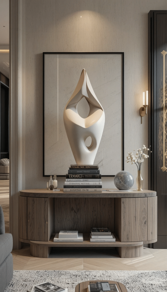Place a bold art piece or sculptural decor item on top of your stacked books. This turns your book counterpiece into a focal point rather than just an accessory.