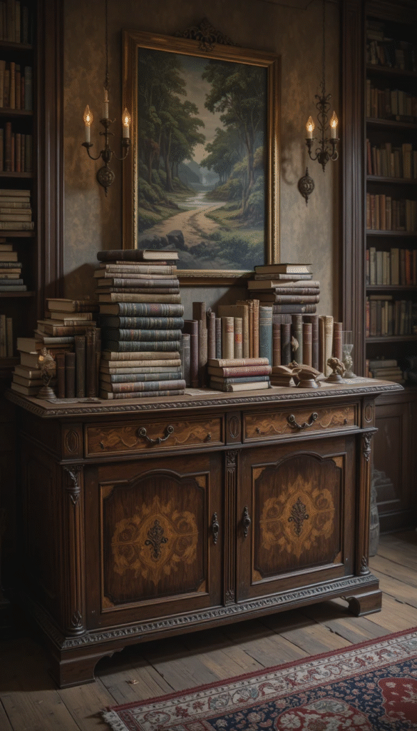 Use antique or thrifted books with worn covers for a nostalgic look. Stack them casually for a lived-in aesthetic. This idea works beautifully in traditional or cottage-style homes.