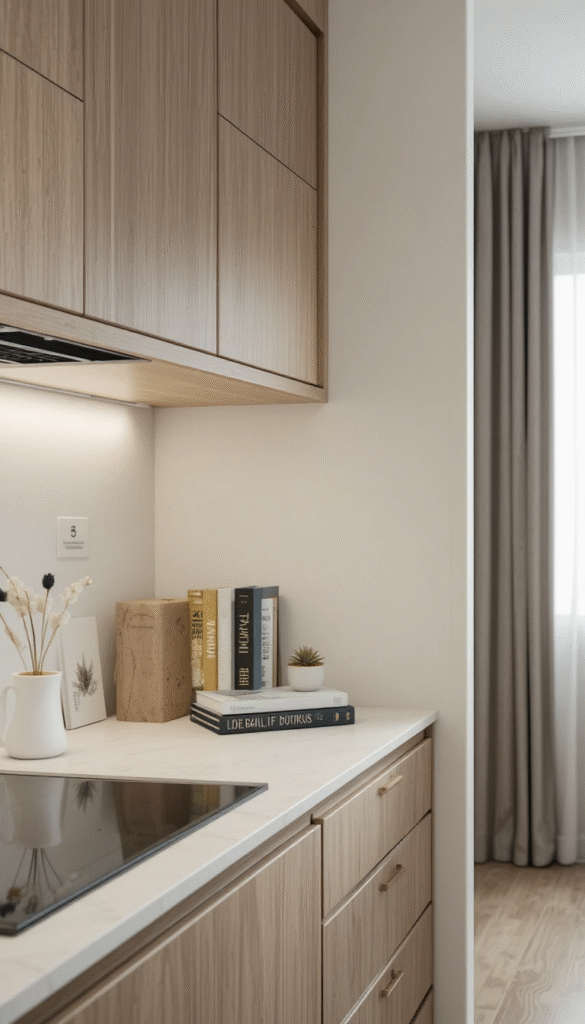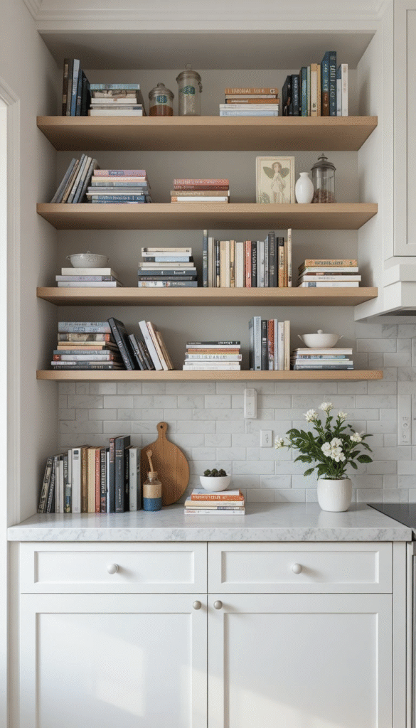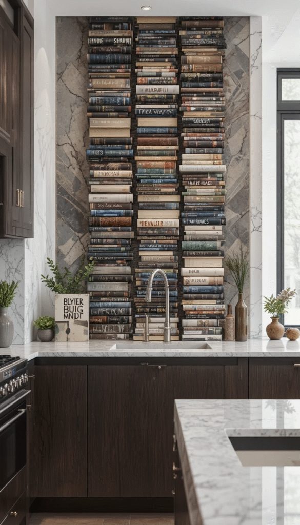 Position a mirror behind your book stack to reflect light and create depth. This trick makes smaller kitchens feel more spacious.