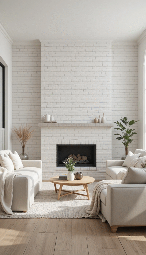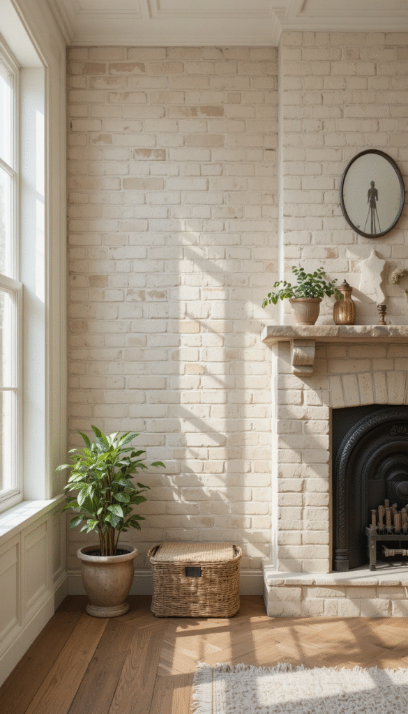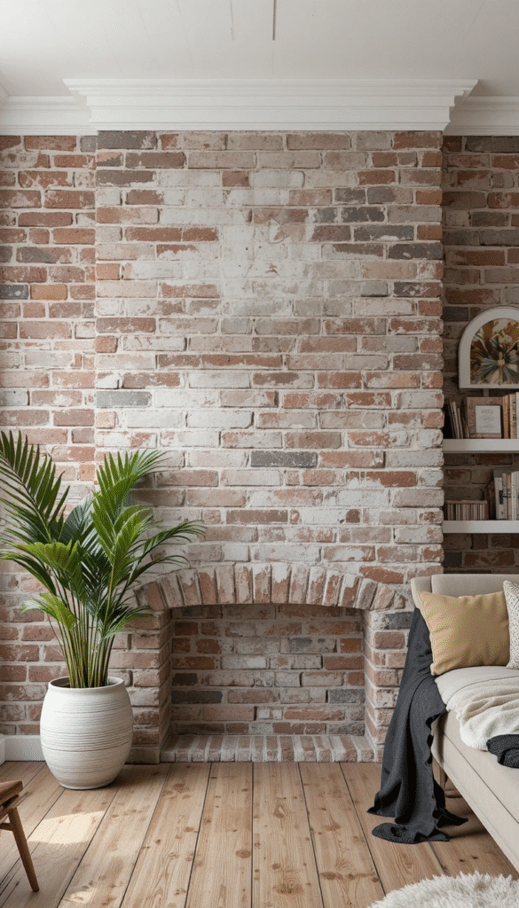 Whitewashed brick walls remain a top trend in 2026 because they offer texture without heaviness. They brighten rooms, reflect natural light, and pair beautifully with modern farmhouse and Scandinavian interiors. This look is ideal for living rooms and bedrooms where a calm, airy feel is desired.