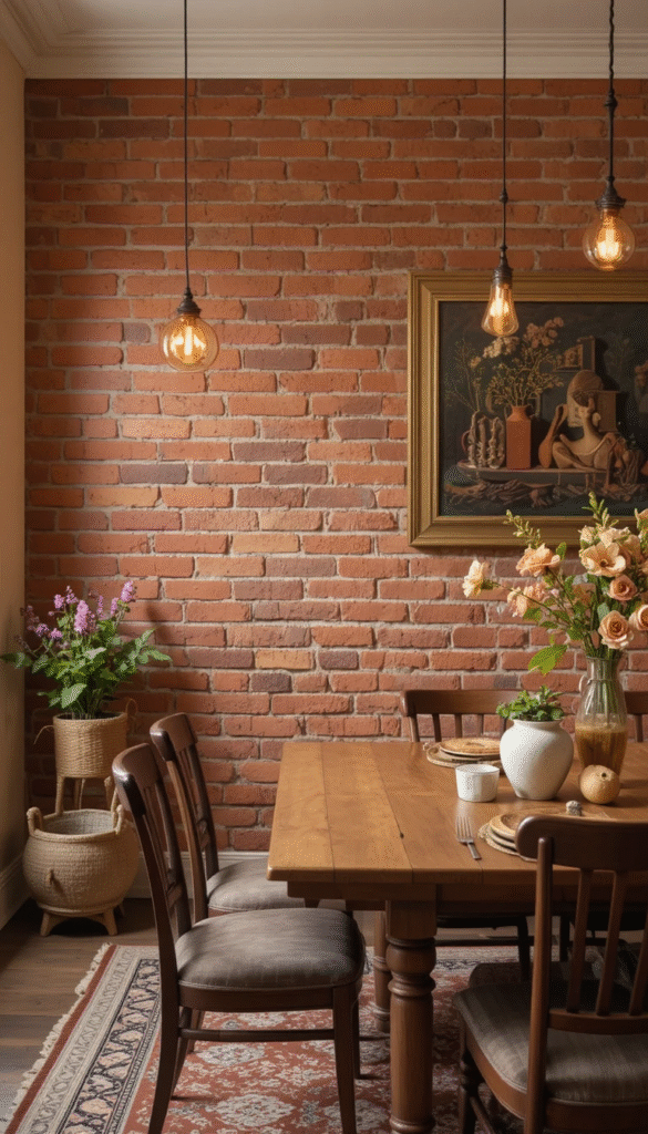 Brick walls painted in terracotta, clay, and muted beige tones are trending strongly. These colors add warmth while keeping the natural brick texture visible. They work especially well in dining areas and family rooms where comfort matters most.