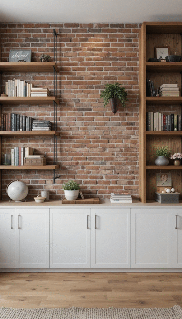 Functional design is key in 2026, and brick walls with integrated shelves are both stylish and practical. Open wooden or metal shelving mounted on brick creates a strong visual contrast while providing storage and display space.