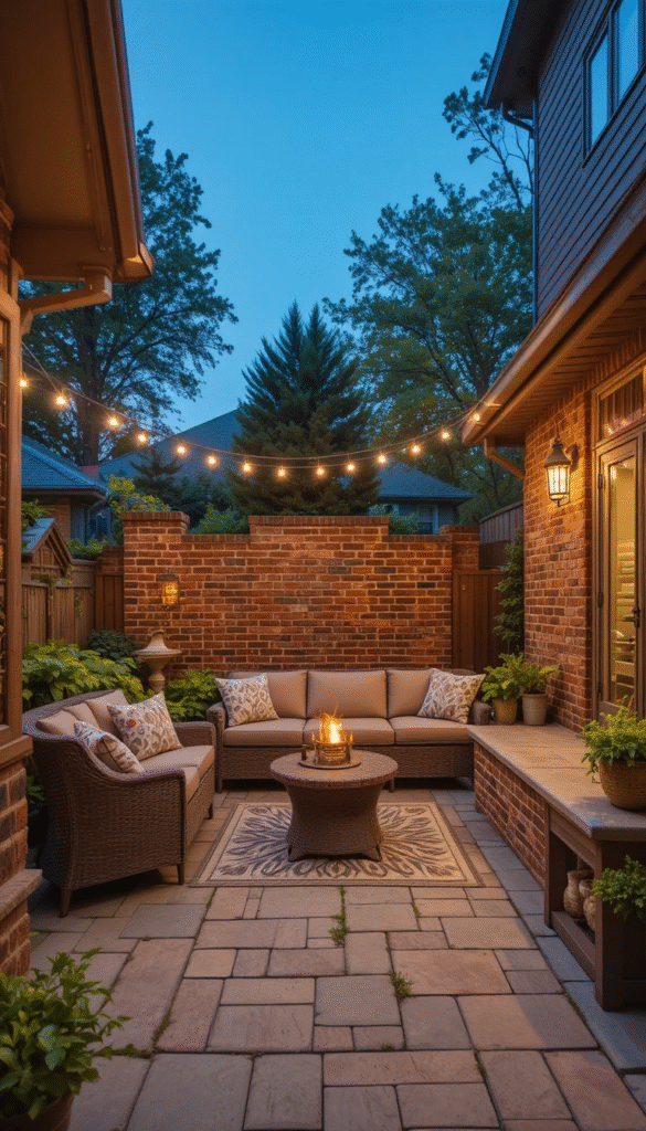 Brick wall design ideas 2026 extend outdoors with weathered brick feature walls. These walls add character to patios and backyards, especially when combined with string lights, greenery, and outdoor seating for a cozy American outdoor living vibe.