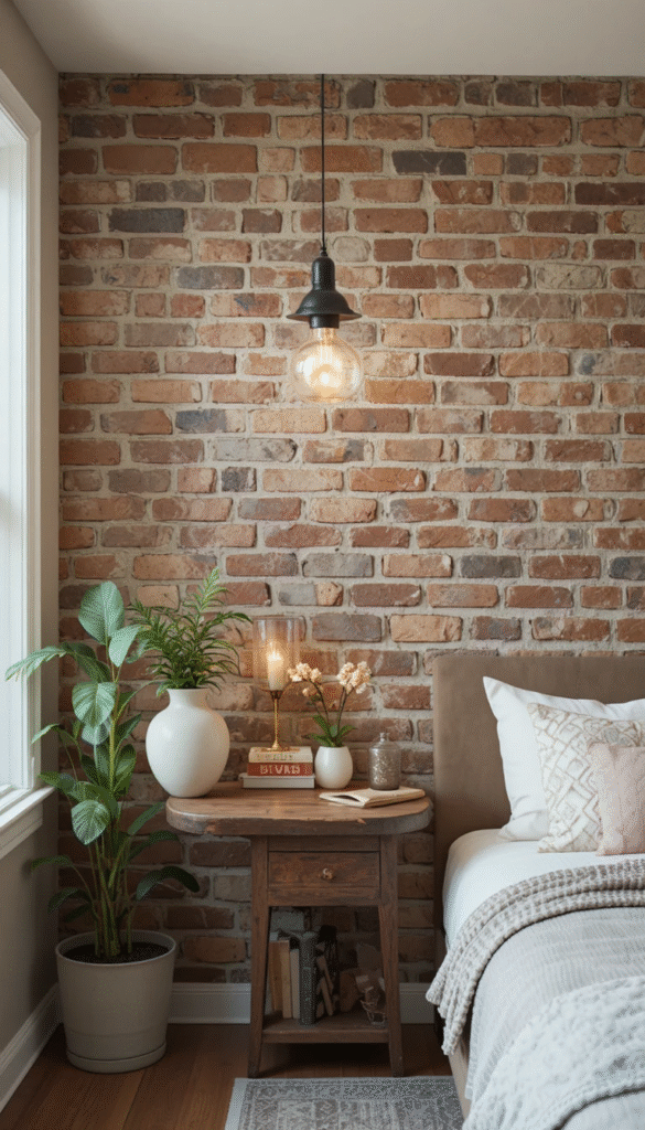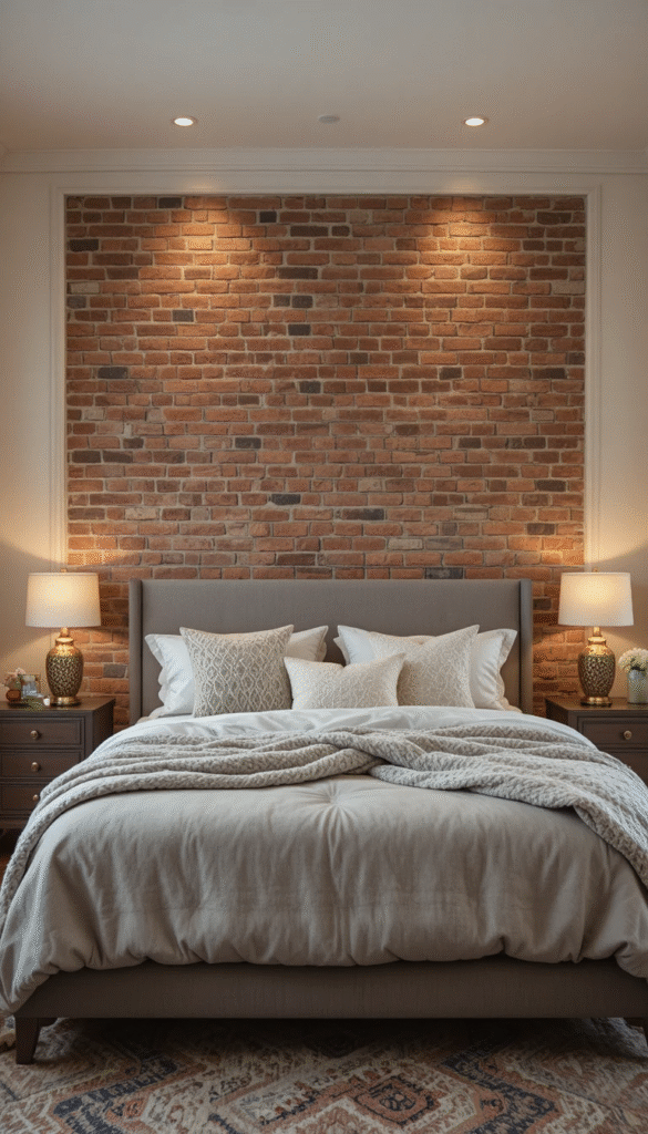 Brick walls in bedrooms are designed to feel cozy rather than industrial in 2026. Soft lighting, neutral bedding, and painted or whitewashed bricks help create a relaxing atmosphere.