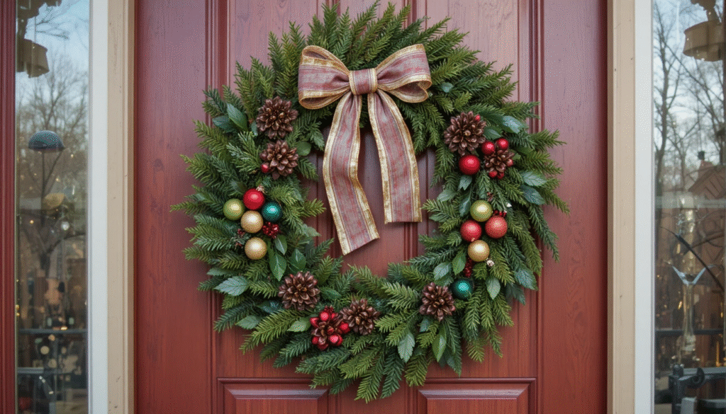 Your front door sets the tone for your holiday style, and you don’t need an expensive wreath to make it look festive. You can craft your own wreath using inexpensive greenery, ribbon, or ornaments. Another option is to tie a big, bold bow around your door for a dramatic, budget-friendly effect. These simple touches create a cheerful entrance that welcomes guests before they even step inside.