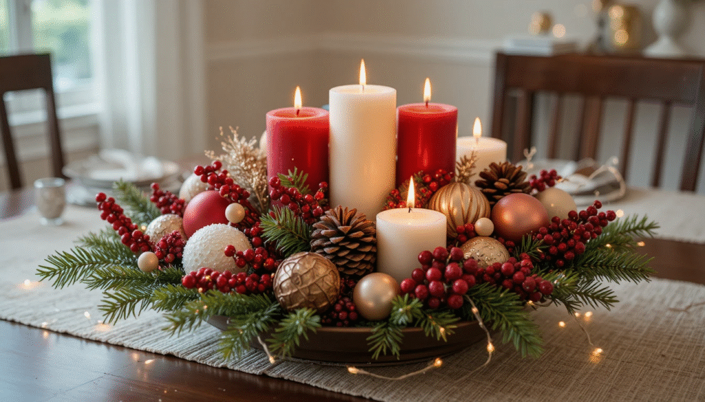You can design an eye-catching centerpiece using items from dollar stores or things you already have at home. Fill a tray or bowl with ornaments, candles, pinecones, or berries arranged in different heights and textures. Add a strand of fairy lights for an extra magical glow. This inexpensive setup makes your dining table look sophisticated without spending much time or money.
