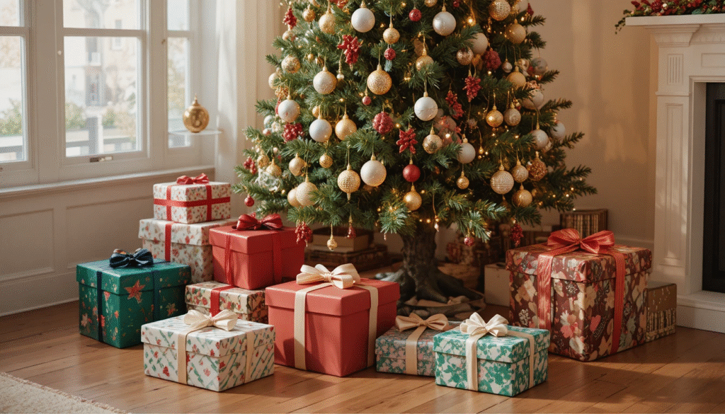 Decorating with wrapped boxes is an easy and affordable way to add color and dimension to your holiday space. You can wrap empty boxes in coordinating paper and ribbon to match your theme, then place them under the tree, on shelves, or near doorways. This creates a festive atmosphere and helps fill empty areas that might otherwise look plain. Best of all, you can reuse the boxes year after year.