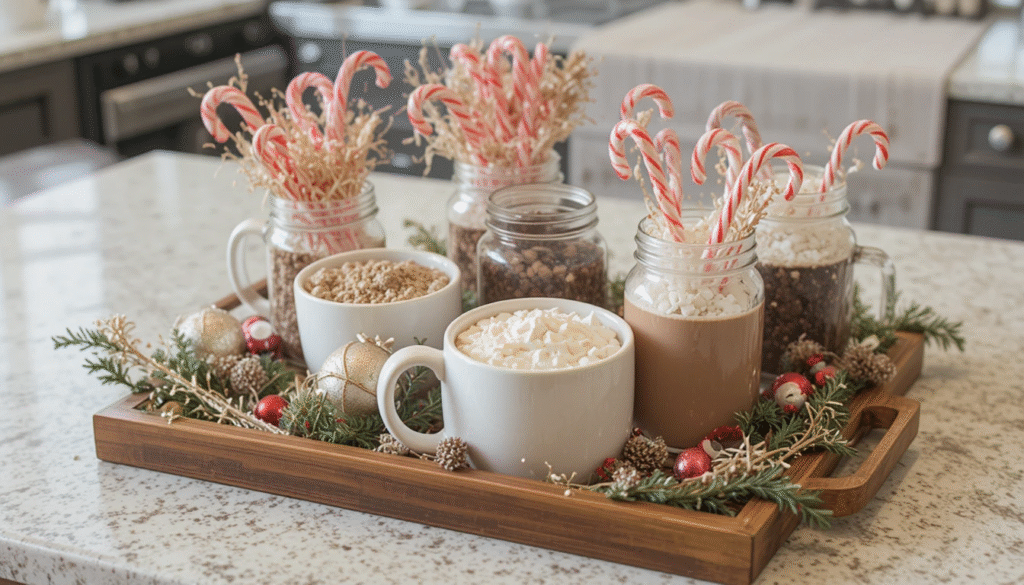 A simple hot cocoa bar not only adds charm to your kitchen but also creates a special holiday experience for your family and guests. Use inexpensive mugs, mason jars, or trays to arrange cocoa mix, toppings, and candy canes. Decorate with a few small ornaments or greenery for extra cheer. This cozy station makes your home feel extra festive without costing much.
