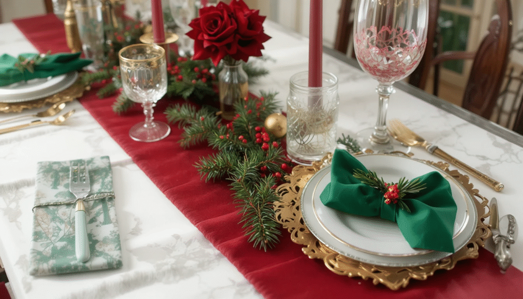 Nothing says Christmas quite like the timeless combination of red and green. Use a deep red table runner, emerald napkins, and touches of gold in your cutlery or candleholders. Add a few pine branches or holly sprigs as natural decor to bring the outdoors in. This classic palette instantly gives your table a festive and traditional look.