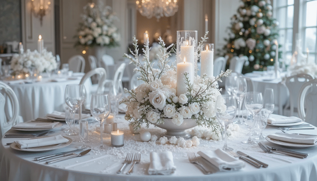 For a fresh and sophisticated touch, try an all-white theme with silver or crystal accents. Think white tablecloths, frosted glassware, and snowy candles. You can even sprinkle artificial snow or glitter on the centerpiece to create a magical winter vibe. The result is an elegant, serene setting that feels like a snowy Christmas morning.