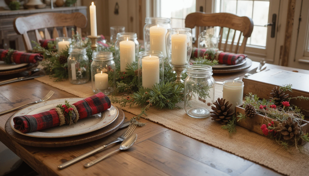 If you love cozy and natural settings, go for a rustic farmhouse Christmas table. Use a burlap runner, wooden chargers, and plaid napkins. Add greenery, pinecones, and candles in mason jars for a warm country charm. This look feels homey and inviting, perfect for relaxed family dinners.