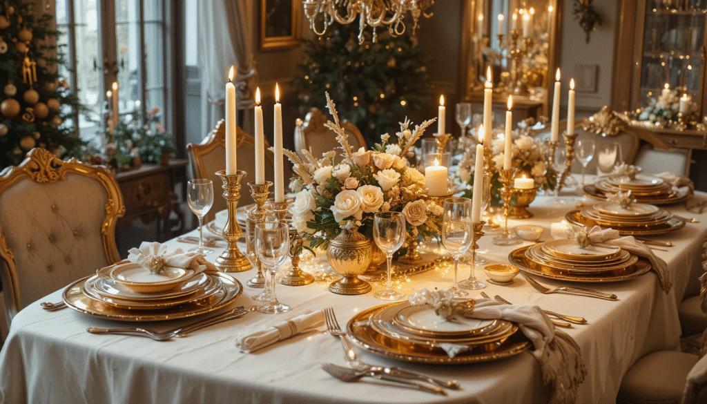 Make your Christmas dinner shine with a gold-themed table setup. Choose gold-rimmed plates, candleholders, and cutlery. Pair them with white or cream linens to balance the sparkle. A glittering gold centerpiece or metallic garland across the table adds that luxurious holiday glow everyone loves.