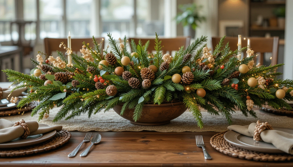 Bring nature to your table with a woodland-inspired theme. Use a centerpiece made of evergreen branches, pinecones, berries, and twinkling fairy lights. Add wooden placemats and earthy-toned napkins. This style creates a cozy, forest-like atmosphere that’s both warm and refreshing.