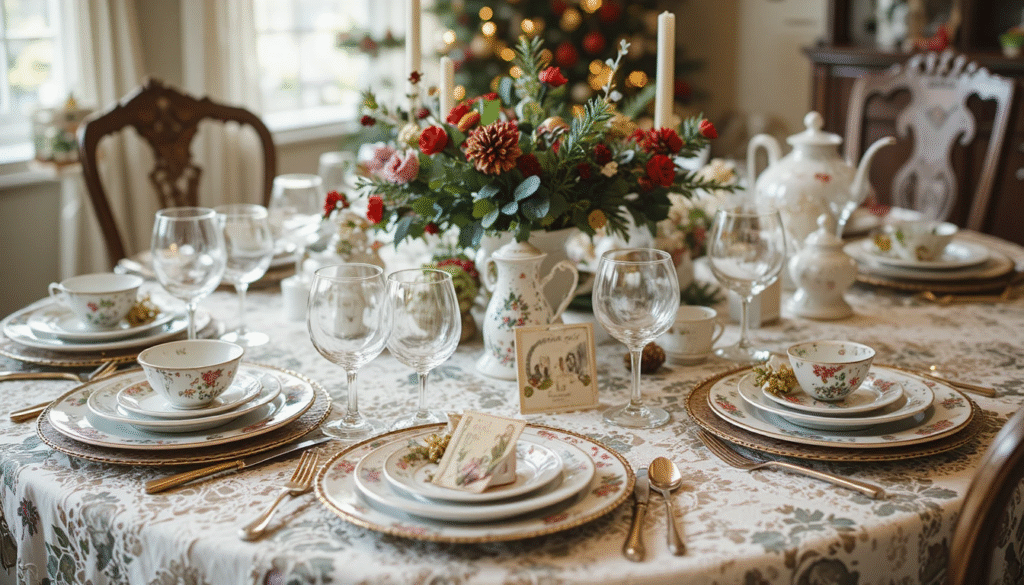 Add nostalgia to your table with vintage Christmas elements. Use heirloom china, lace tablecloths, and antique glassware. Place small retro ornaments or old-fashioned Christmas cards at each setting for a personal touch. The charm of vintage decor brings back memories of old-fashioned holiday gatherings.