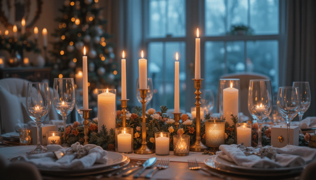 Create an intimate and magical feel with a candlelit dining setup. Mix candles of different heights — pillar, taper, and tea lights — along the center of the table. Use gold or crystal candleholders for an elegant touch. The soft glow of candlelight sets a romantic and festive mood perfect for Christmas Eve dinner.