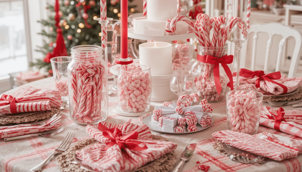 Play up the fun side of Christmas with a red and white candy cane theme. Decorate with striped napkins, peppermint-filled jars, and candy cane centerpieces. Add pops of red ribbon around candles or napkin rings. This cheerful and sweet theme will bring smiles to both kids and adults alike.