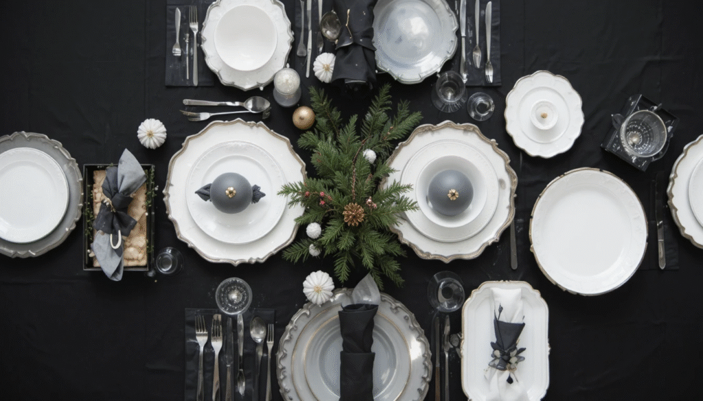 For a bold twist, try a black and white Christmas table decor. Use a black tablecloth with white dishes and silver cutlery for a sleek, contemporary vibe. Add a touch of greenery or gold to keep it festive. This chic, modern setup is perfect for those who prefer a stylish and sophisticated Christmas look.