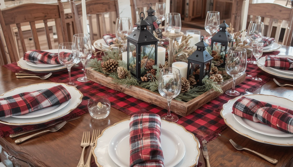 Plaid never goes out of style during the holidays. Use a red plaid table runner or napkins to bring warmth and coziness to your decor. Pair with white dishes and rustic centerpieces like lanterns or wooden trays filled with pinecones. Plaid instantly gives your table that cozy, cabin-in-the-snow feel.