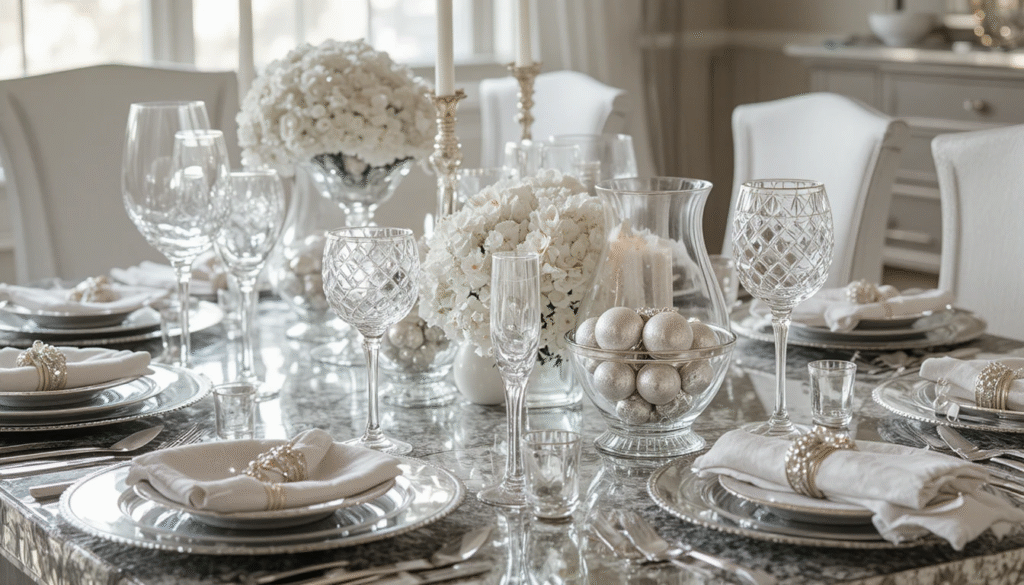 For a dazzling festive look, combine crystal and silver accents. Use mirrored chargers, crystal glassware, and silver napkin rings. Add silver ornaments in clear bowls or glass vases as centerpieces. This shimmering setup feels luxurious and adds just the right amount of holiday sparkle.