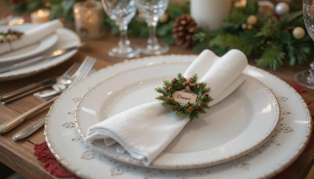 Make every guest feel special with personalized place cards or custom napkin rings. Write names on small ornaments, wooden tags, or mini wreaths placed on each plate. It’s a simple way to add warmth and thoughtfulness to your Christmas dinner table.