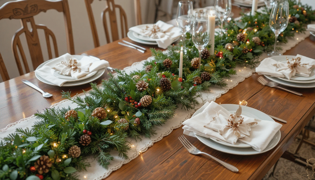 Decorate your dining table with a fresh greenery garland running down the center. Add pinecones, berries, and fairy lights to enhance the natural look. You can even mix in eucalyptus or rosemary for a lovely scent. This simple yet beautiful touch gives your table a fresh, organic, and elegant Christmas feel.