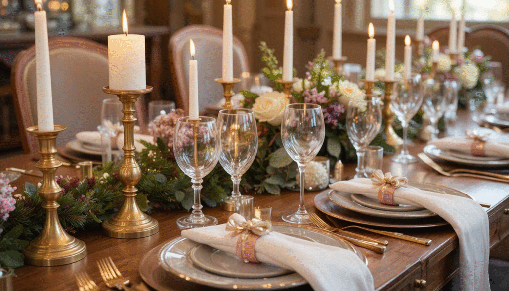 Can’t choose between gold, silver, or copper? Combine them for a metallic mix theme. The contrast of warm and cool tones adds visual interest and sophistication. Use metallic candleholders, flatware, and napkin rings, ensuring each metallic shade appears evenly across the table. The result is a rich, festive sparkle that feels modern yet timeless.