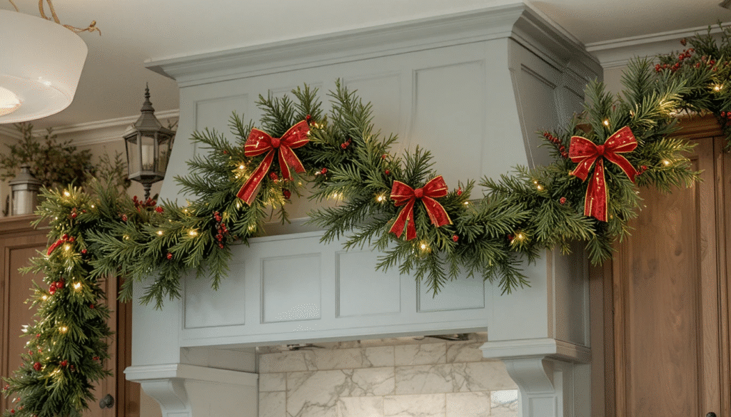 A simple yet stunning way to elevate your kitchen’s holiday look is by draping green garlands above your cabinets. You can go natural with pine or cedar branches or choose a faux garland with built-in lights. Add a few red bows or berries for a traditional touch that instantly brings festive charm.