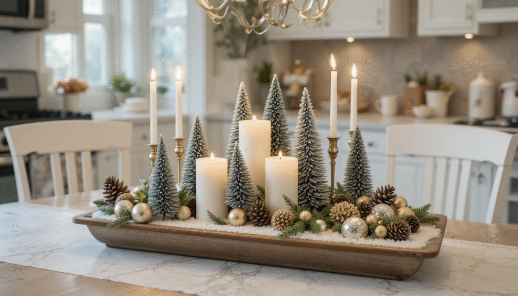 If your kitchen includes a dining area or island, create a Christmas-themed centerpiece using candles, pinecones, and ornaments. A tray with miniature trees, faux snow, and string lights can transform your kitchen into a winter wonderland. Keep it balanced enough to impress, but not too cluttered.