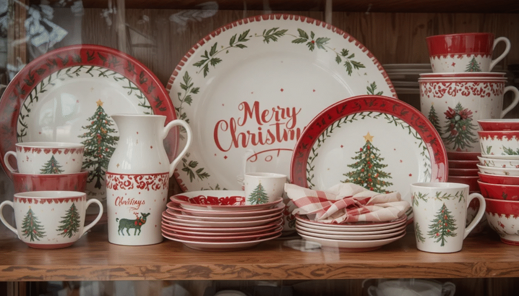 Replace your usual plates and mugs with festive dishware during December. Think red, green, and white tones with holiday prints or messages like “Merry Christmas” or “Joy.” Displaying them on open shelves or in glass cabinets enhances the festive look while keeping your essentials accessible.