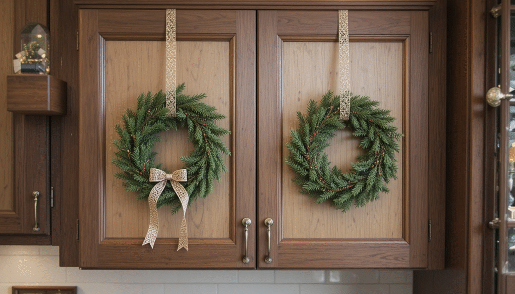 For a charming and classic touch, hang mini wreaths on your cabinet doors using ribbons. Whether you prefer rustic pine wreaths or elegant ones with gold accents, this simple addition makes your kitchen look more cohesive and holiday-ready.