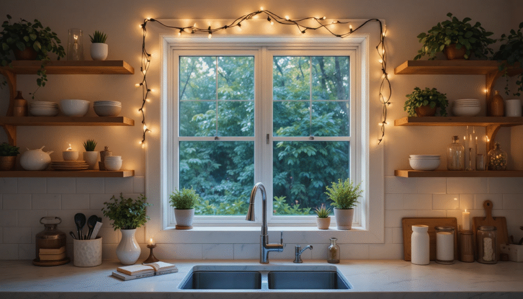 String lights instantly create a warm and cozy ambiance. Drape fairy lights along shelves, windows, or above your sink to illuminate your kitchen with a magical glow. Opt for warm white lights to maintain a welcoming, homey vibe without overpowering the space.