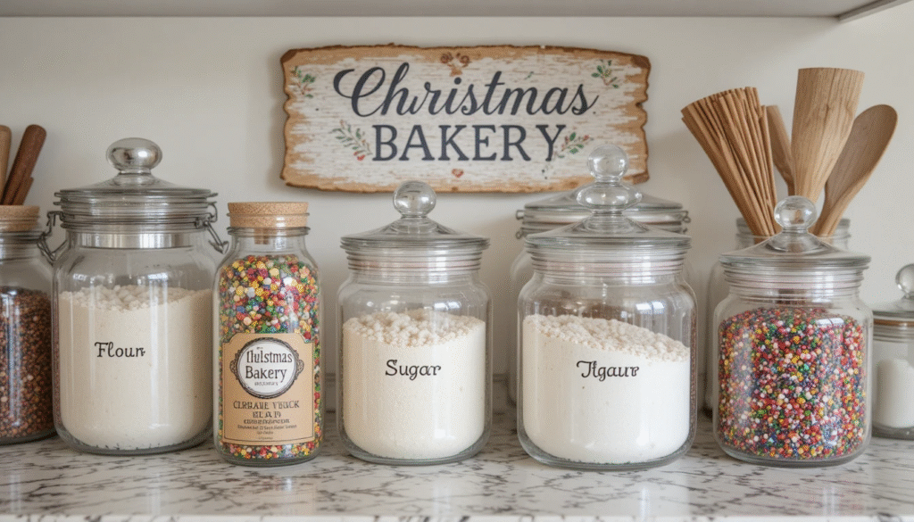 Create a dedicated holiday baking or cookie station on your countertop. Use festive jars for flour, sugar, and sprinkles, and add a decorative sign that says “Christmas Bakery.” It’s both practical and decorative, perfect for families who love baking during the holidays.