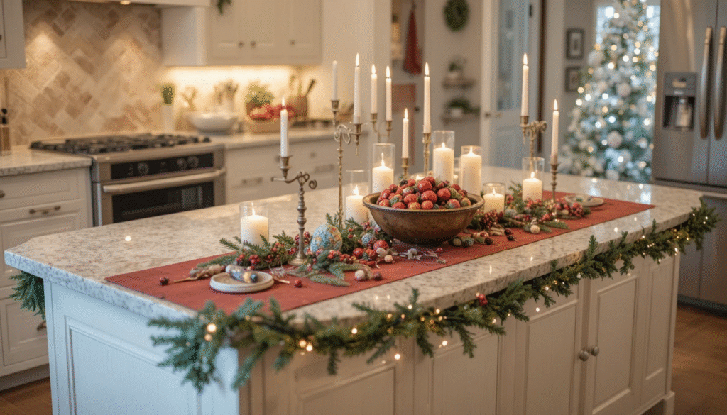 If you have an island, turn it into a holiday focal point. Use a Christmas runner, a few candles, and a decorative bowl filled with ornaments or cranberries. You can even hang garlands around the island’s edge for a full festive effect.