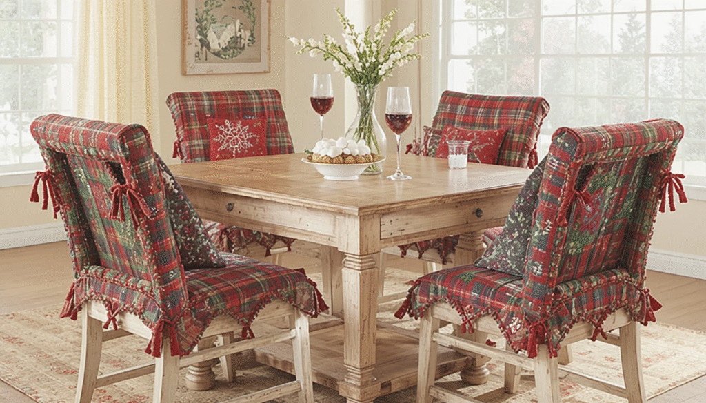 Give your kitchen seating a seasonal upgrade with Christmas-themed cushions or chair covers. Choose fabrics with plaid patterns, snowflakes, or holiday quotes. This cozy addition makes your dining area more comfortable and instantly festive for family meals.