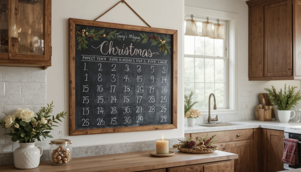 Add excitement to your kitchen by hanging a Christmas countdown calendar or chalkboard. Write a new holiday message each day or count down the days until Christmas Eve. It’s a fun and interactive way to keep everyone in the holiday spirit while adding charm to your kitchen walls.
