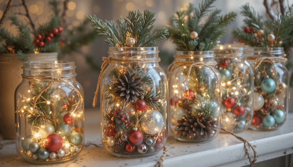 Mason jars are incredibly versatile for holiday decorating. Fill them with mini ornaments, pine branches, or fairy lights to create quick and easy Christmas accents. Place them on your countertops, windowsills, or shelves for a rustic yet elegant holiday touch.