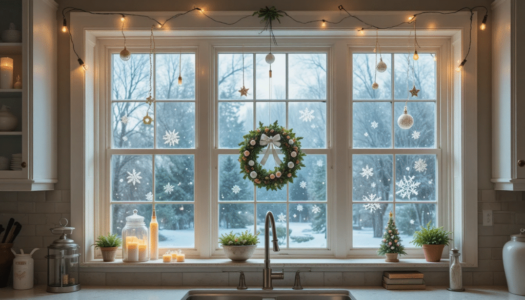 Don’t forget your kitchen windows! Add hanging ornaments, frosted decals, or snowflake cutouts to create a festive view while you cook. A small wreath or a string of lights around the window frame can make even the simplest kitchen feel merry and bright.