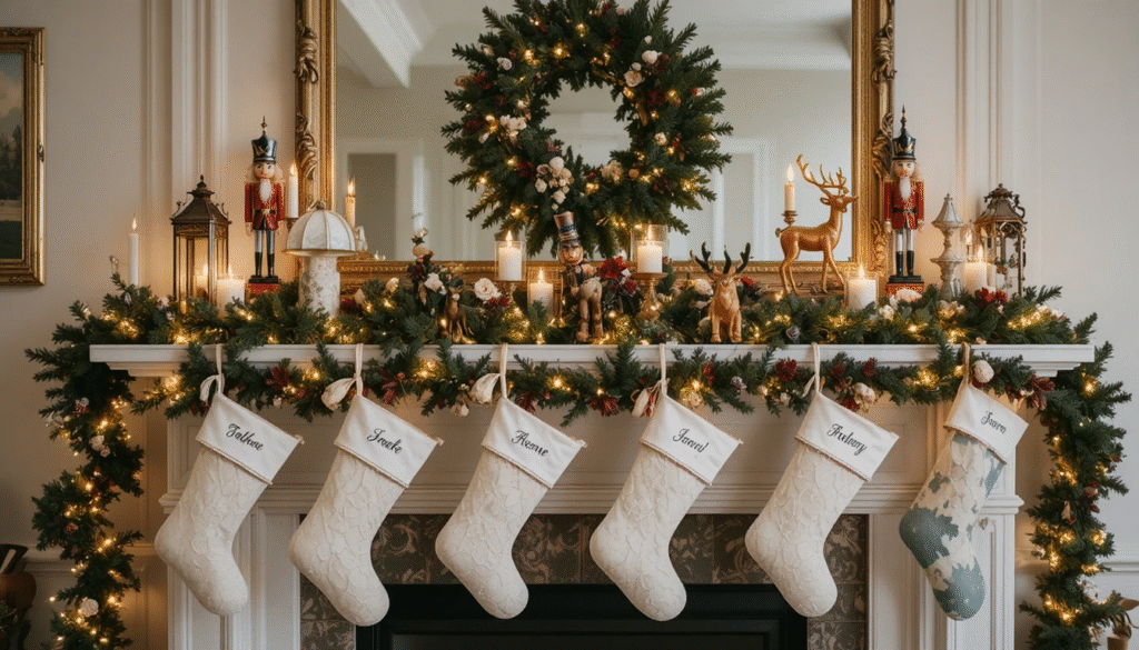 The fireplace mantel is one of the best places to showcase your classic decor theme. Layer lush garlands with twinkling fairy lights and hang stockings with personalized name tags. Add candle holders, nutcrackers, or miniature reindeer figures for an extra festive touch. A large mirror or framed holiday artwork above the mantel will reflect light and make the entire setup feel more enchanting and cozy.