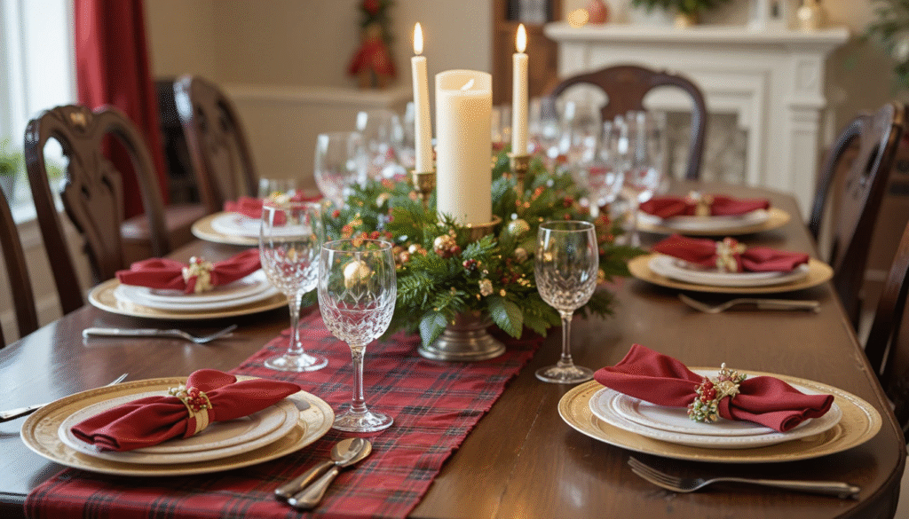 Your dining area deserves just as much festive love. Use a red or plaid table runner, elegant dinnerware, and crystal glasses for a timeless look. Add greenery or a candle centerpiece for height and balance. Napkin rings made from ribbon or small ornaments can add a personal touch. The goal is to create a table that feels both sophisticated and inviting, perfect for cherished family dinners.