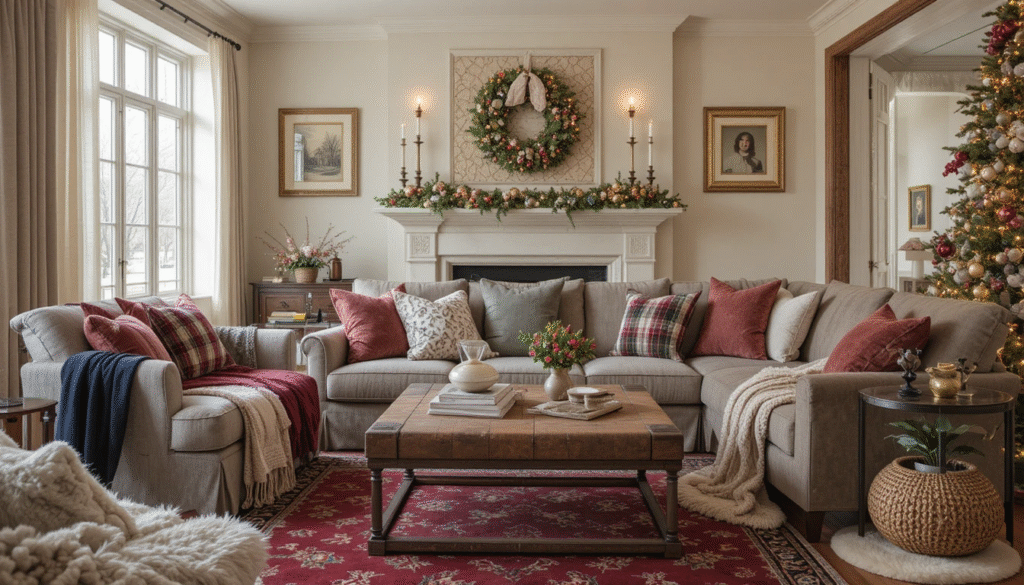 The key to making your space feel warm and festive is layering soft, cozy fabrics. Use plaid throws, velvet cushions, and knitted blankets to create an inviting atmosphere. Add a red or gold area rug for extra warmth underfoot. Mixing textures not only adds comfort but also enhances the depth and richness of your holiday decor.