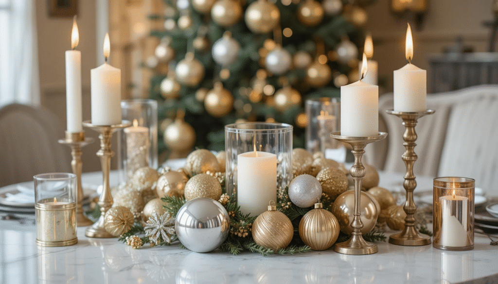 Metallic elements like gold, silver, or bronze ornaments add a luxurious sparkle to your Christmas setup. Use them on your tree, as part of your centerpiece, or even in candle holders. Reflective surfaces help bounce light around the room, making your space feel brighter and more festive. The subtle shimmer of metallic decor ties the whole theme together beautifully.