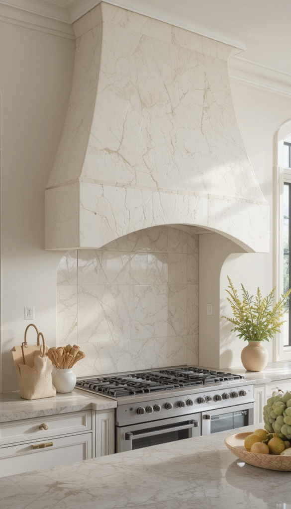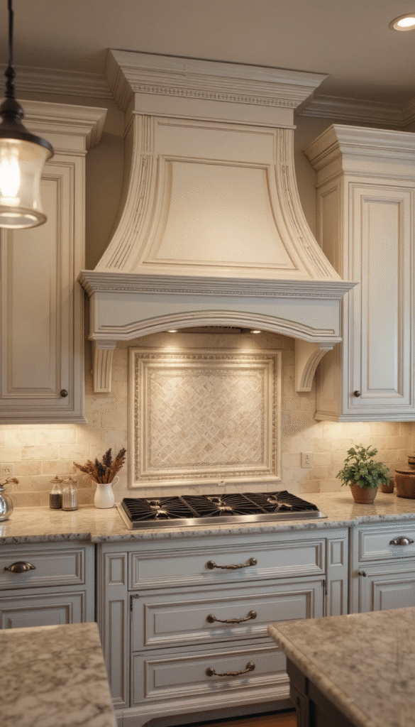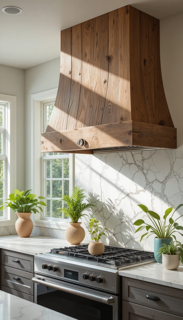One of the biggest design trends this year is the plaster-style vent hood cover. This look mimics high-end European kitchens and creates a soft, organic appearance. After building the wood frame, apply drywall compound or plaster layers to achieve a textured finish. Sand lightly for smoothness while keeping subtle texture visible. Neutral beige or creamy white tones complete the elegant aesthetic.